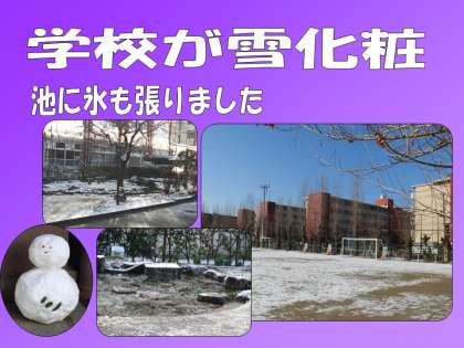 日本列島中が雪雲に覆われた日の朝,小栗栖校も雪化粧になりました。中庭の池も分厚い氷が張り,朝早く登校した児童は,雪だるまを作ったり,池の氷を割ったりと冬の楽しみを味わいました。