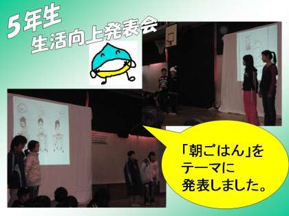 1月28日に,5年生の「朝ごはん」についての生活向上発表会をしました。寒い中でしたが,今年度最後の発表を,しっかりと締めくくってくれました。