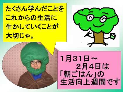 来週の一週間は,朝ごはんの「生活向上週間」です。1・2年生は「生活向上がんばりカード」,3〜6年生は「生活向上メニュー」をします。子どもたちの頑張りを,ご家庭でも見守っていただけるとうれしいです。