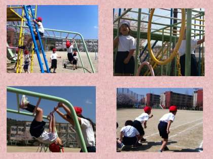 6月の運動会に向けて50メートル走のタイムを計りました。その後,総合遊具の遊び方の約束を教えてもらったあと,みんなで楽しく遊具で遊びました。