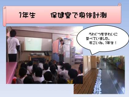 1年生が保健室で初めての身体計測をしました。まずは,養護の先生から保健室の約束を教えてもらいました。みんな行儀良く真剣にお話を聞いていました。