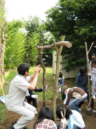 3.柱を立てます。このとき,二股に分かれている柱を使い,横の梁を支えます。