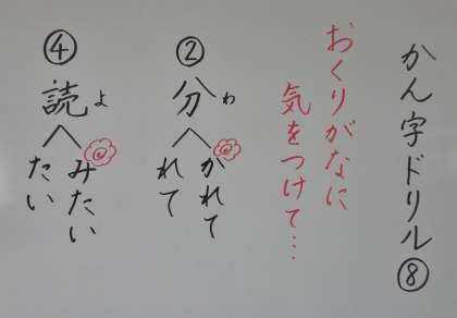 先しゅうから,かん字ドリルのれんしゅうもんだいのページをかだいにしています。しっかりとすすめることができていますか?かん字ドリルの「8」では,おくりがなのもんだいがたくさん出ています。正しいおくりがなをおぼえてくださいね!