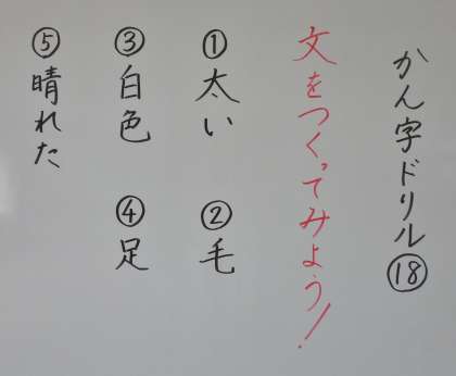 かん字ドリルの「18」では,青木さんがかん字をつかって文しょうを書いています。かん字は,しっかりとおぼえたあとに,自分の生かつの中でつかえるようになることが大せつです。「太い」「毛」「白色」「足」「晴れた」のかん字をつかって,みんなも文しょうをつくってみましょう!