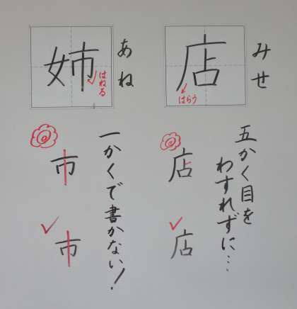 今日(きょう)のかん字は「姉」と「店」です。「姉」というかん字の右がわは,たての線を一本で書かないように気をつけましょう!お手本をよーく見ながら書いてくださいね。