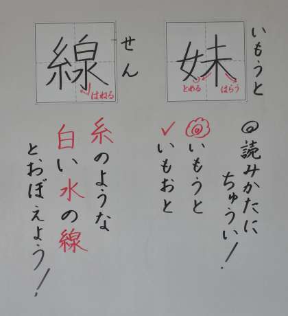 今日(きょう)のかん字は「妹」と「線」です。「妹」というかん字は読みかたに気をつけてください!「いもおと」ではなく,「いもうと」です!