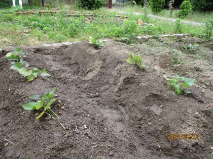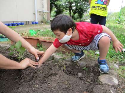 夏野菜が目覚ましい生長を見せる中,新たにさつまいもを植えました。