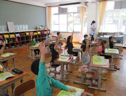 今日から本格的に授業が始まりましたが,手を挙げてたくさん発表をする子がとても多く,うれしいです。静かに手を挙げて,あたったら「はい」と言ってから,立って発表するという練習をしています。意欲的に発表できていて,はなまるです♪