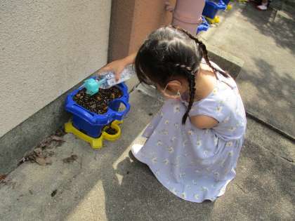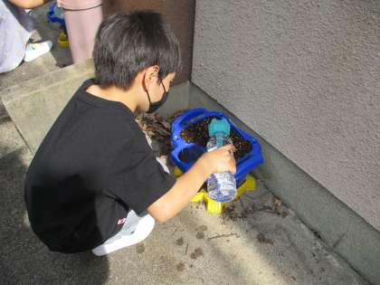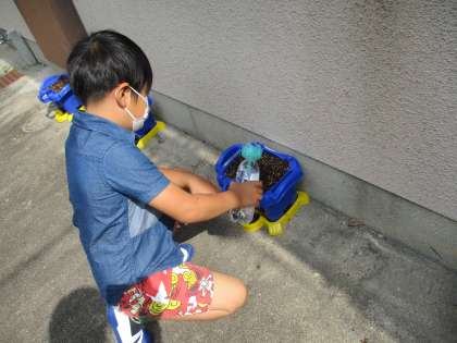 朝学校に来てすぐにあさがおに,水やりをしました。