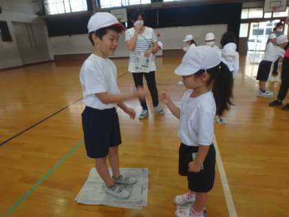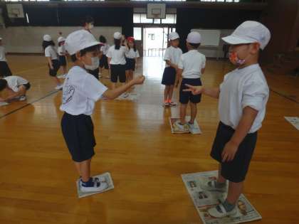体育科の学習で「体ほぐしのうんどう」をしています。子どもたちは体全体を使ってじゃんけんをしたり,バランスをとって新聞紙の上に乗ったりして,体を動かす楽しさを感じることができました。