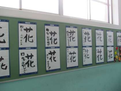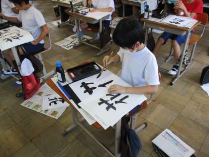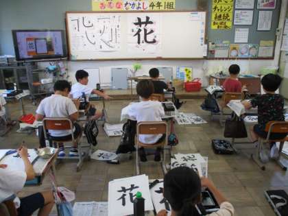 最初に,準備や片づけの仕方,机の上の用意の仕方を確認し,練習をしてから半紙に「花」の字を書いていきました。