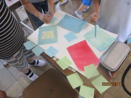 今日は出来上がった作品を友達同士で見合って,「すてきなところ」を付箋に書いて伝え合う活動をしました。積極的に友達のいいところを探す,とてもすてきな時間になりました。