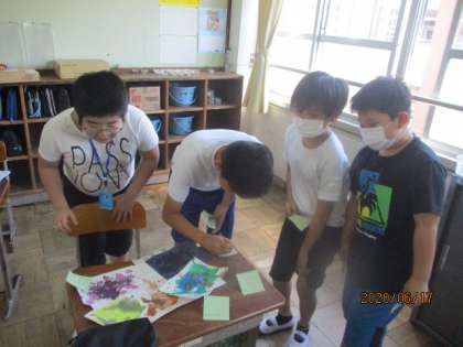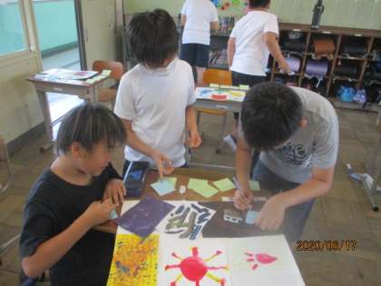 図画工作科では自分の心の様子を色や形、さまざまな技法を使って表現しました。楽しい気持ち,うれしい気持ち,悲しい気持ちなど…自分の感じ方を大切にしながら,一生けん命に作品を完成させました。