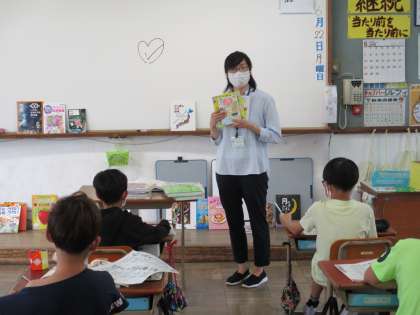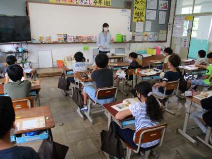 国語の学習の中に「学校図書館の使い方」という単元があり,司書教諭の永井先生に来ていただき,図書館の使い方やラベルの見方など,ていねいに教えていただきました。