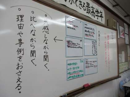 今日は「聞いて,考えを深めよう」の最後の学習でした。今日は話を聞くときに大事なことについて考えました。班で話し合うことでいろいろな意見を出し合うことができました。