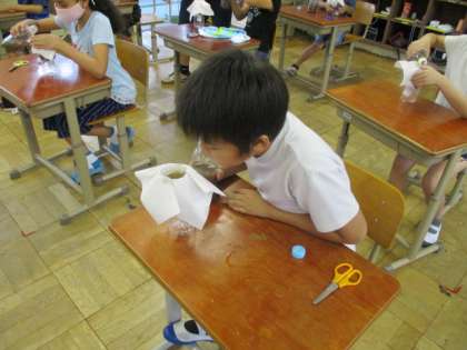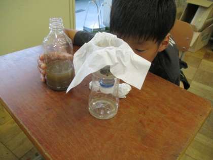 持ってきた泥水を見て,「こんな汚い水きれいになるわけないやん」と子ども達が言っていたのですが,いざろ過をくり返していくうちに,水がどんどんきれいになっていき,「うわ〜めっちゃきれいになった」「飲めそう」という声が聞こえてきました。