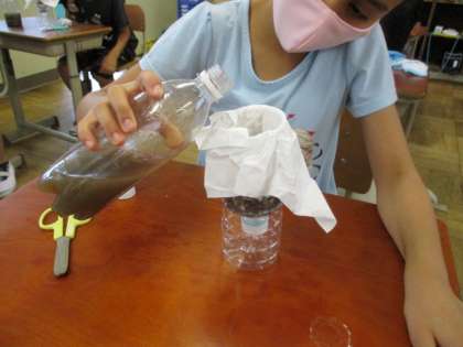 4年の社会科の「くらしと水」の学習の中で,浄水場で水を「ろ過」しているということを子ども達は学習したので,ペットボトルを使って一人ずつろ過装置を作り,実際にろ過を体験してみました。