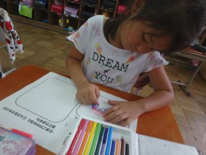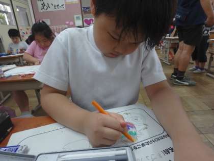 図画工作科の学習で,自分だけのたまごを描き,そこから出てくるものを考えました.どの子のたまごも「もよう」や「色」がおもしろく,完成がとっても楽しみです。