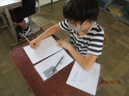 集中して書いている姿はとてもかっこよかったですし,友達の作品を見て,「めっちゃ上手!」「すごいな!」と声をかけあう姿が見ていて,とてもうれしかったです。