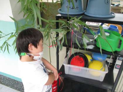 校内に生えている笹を切ってもらい,七夕かざりを作りました。