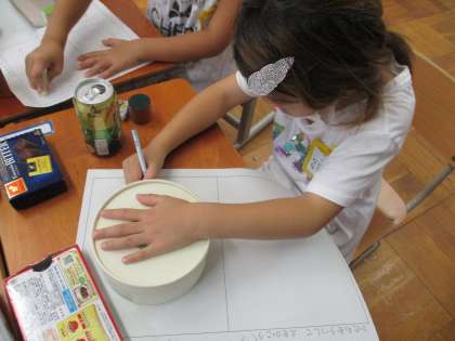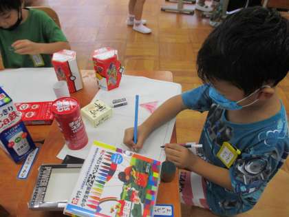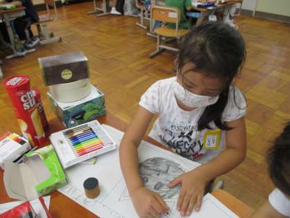 いろいろな箱の形を使って,絵を描きました。「この箱を使うとこんな形が写せる!」と想像しながら,描きたい絵に必要な箱を選んで描いていました。ポテトチップスの箱を使ってくまの耳を描いたり,四角いお菓子の箱を使ってバスを描いたりと楽しみながら学習をしました。