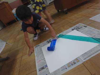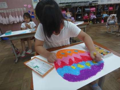 図画工作科の学習で「ひみつのたまご」の学習をしました。先週考えた自分だけのたまごを実際にパスで描いていきます。丁寧に丁寧に色を塗る子どもたち。どの子のたまごも本当にすてきな仕上がりでした。また,同時に背景の色もローラーを使って塗りました。