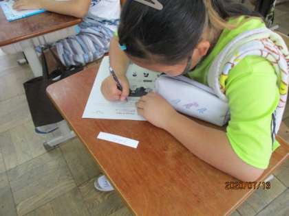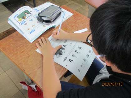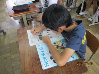 今日はUnit2 の学習に入る前に村田先生から頂いた自分の名前カード(英語版)を見て嬉しそうにワークシートに書いていました。おまけで筆記体バージョンも渡して頂きました。喜んで書いていました。