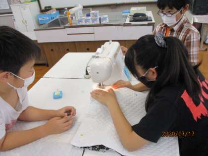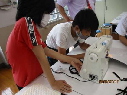 今日は後半グループが両サイドのわきをミシンで縫いました。とても喜んでミシンを使っています。