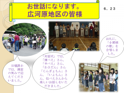 待ちに待った広河原地区の方との交流・民泊の日です。堰源小学校では,到着したバスを満面の笑みで迎えていただき,親しげにお迎えしていただきました。体育館では,早速対面式が始まりました。