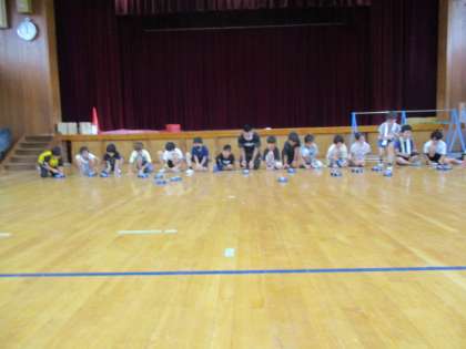 直列につないだ子ども達の車と,並列につないだ先生の車を同時に走らせ,どちらが早く走るのか競争しました。