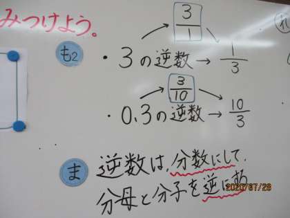 今日の「分数×分数」では「逆数」について学習しました。分数の逆数は,分母と分子を入れかえた分数になります。整数や小数のときは,まず分数にしてから逆数に表します。