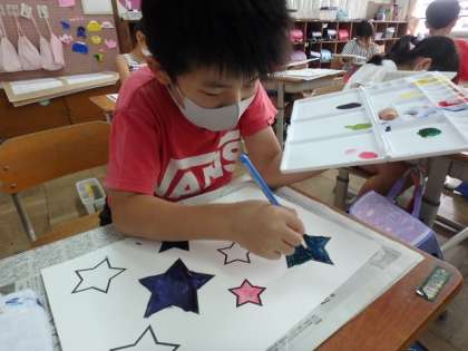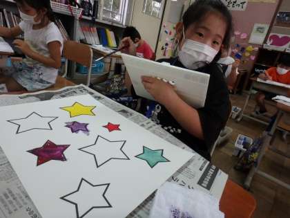 授業の後半では,色を混ぜて自分だけの色を作りました。「先生!こんな色ができたよ!」とできた色を楽しそうに見せてくれる子どもたちがとってもかわいかったです。