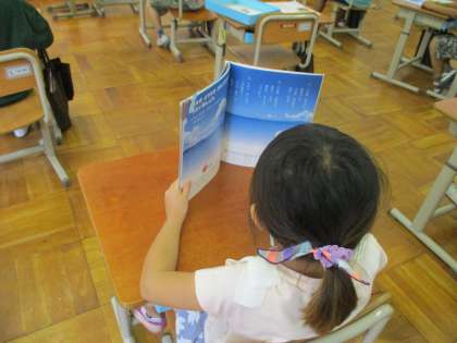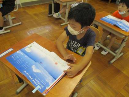 音楽の学習で「うみ」を歌いました。今まで4拍の歌をよく歌っていましたが,この曲は3拍の歌になっています。拍の違いにもしっかり気づくことができました。