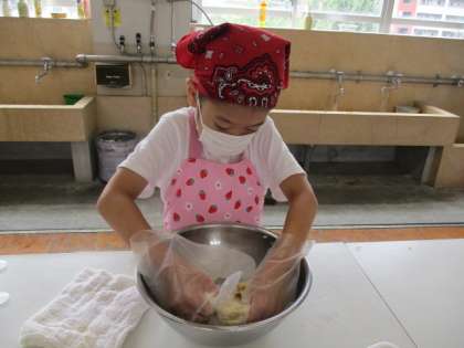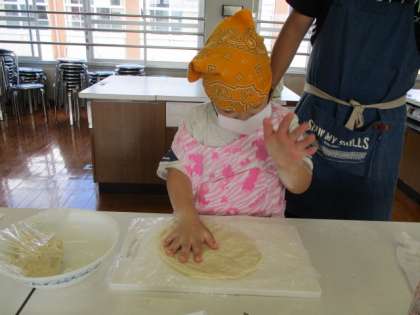 今日は待ちに待ったピザ作り!!まずは生地作りです。生地も一から手作りしました。手順書を見ながらこねたり,まるめたり,伸ばしたりして生地を完成させました。