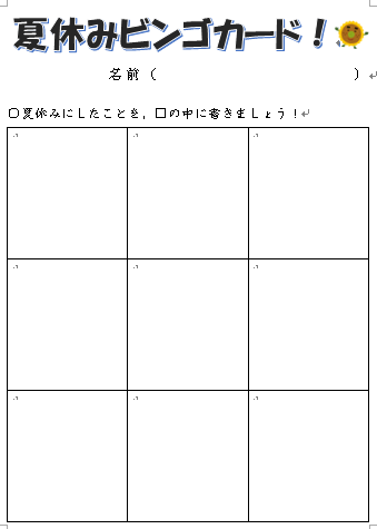らいしゅうに,夏休みの思い出をみんなで話し合いながら,ゲームをしたいと思います!夏休みにしたことをかんがえておいてくださいね。「しゅくだいをがんばった!」「アイスをたべた!」「○○にいった!」みんなのたのしかった思い出を,たくさん聞かせてください!