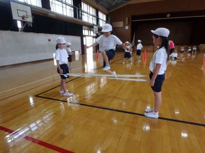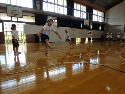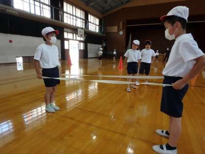 体育科の学習で「とびあそび」をしました。川に見立てた縄を跳んだり,5歩のジャンプでどれだけ遠くまで跳べるのかを競ったりしました。子どもたちは意欲的に取り組み,「手を振って跳ぶ」「勢いをつけて跳ぶ」という,遠くに跳ぶためのポイントにも気付くことができました。