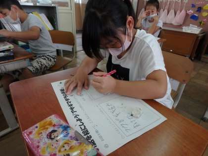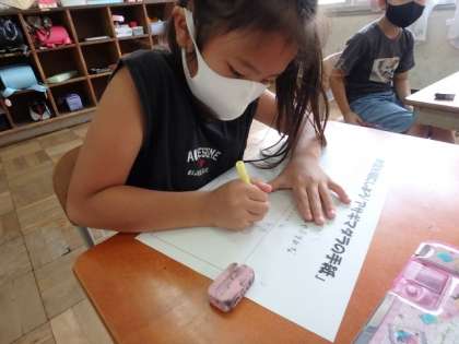 今年,2年生では「アサギマダラの手紙」という本を読んで,絵を描いていきます。この日の授業では,自分が気に入った場面を想像し,アイデアスケッチをしました。また,一人ひとりが想像をふくらませて,アサギマダラの羽の模様を考えました。