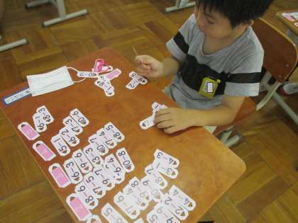 算数の学習でひきざんカードを配り,練習をしました。今日は,同じ答えの仲間わけをしました。今はまだ数図ブロックや指を使いながらの計算ですが,少しずつ答えを覚えていってくれるといいです。