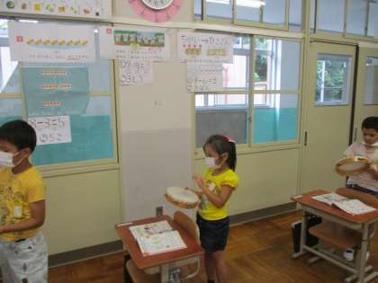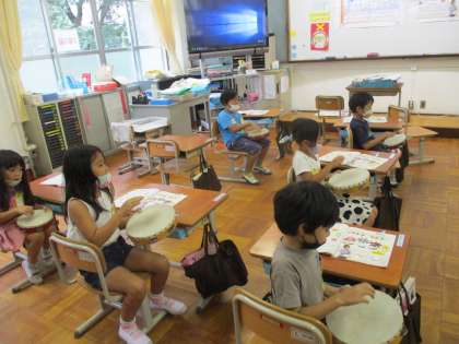 音楽の学習で,タンブリンを使いました。持ち方や叩き方を学習したあとに,「ぶんぶんぶん」の音楽に合わせてリズム打ちをしました。