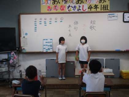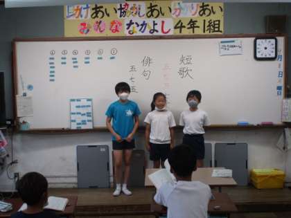 今日の国語は,自分の気にいった短歌・俳句を1つ選んで暗唱し,みんなの前で発表しました。