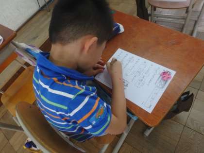 漢字の小テストを行っています。宿題で同じ漢字を3回練習してから小テストに挑戦します。2学期からは,漢字ノートの見本を穴あきにして配布しようと考えています。「ただ書き写すだけ」ではなく,「書いて覚える」ことを目標にしてほしいと思います。