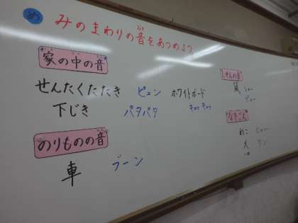 音楽科の学習で身の回りの音さがしをしました。「なきごえ」「のりものの音」「しぜんの音」「家の中の音」の4つに分け,自分の生活を思い返しながら音を探しました。