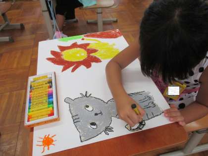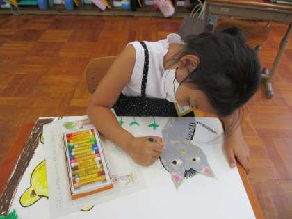 図工で,「サイモンは,ねこである」のお話の絵を描いています。クレパスを使って,丁寧に色を塗っています。