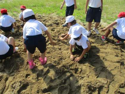 まずは,先生が砂の中に隠したお宝を皆で探しました。