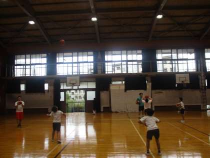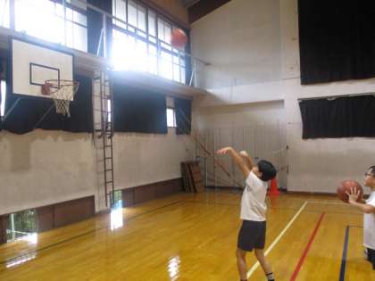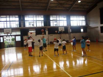 サッカー部はあいにくの雨で中止となってしまいましたが,バスケットボール部に入った子は,先生から投げ方などをていねいに教えてもらって,本当にうれしそうに活動していました。