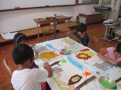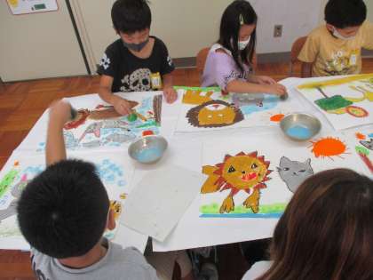 「みてみておはなし」の絵の仕上げに,タンポを使って背景の色を塗りました。ポンポンッと楽しく色をつけることができました!!