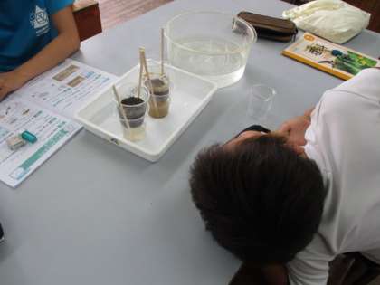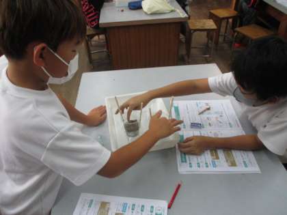 運動場の土と砂場の土を見比べ,土の粒の大きさの違いに気づいた子ども達は,「粒が大きい方がすき間があって速くしみこむはずだ」などの予想を立てながら,ペアで実験をすることが出来ました。