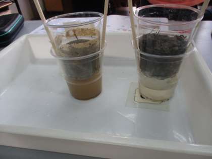 今日は理科室で,土の種類によって水のしみこみ方に違いがあるのかを実験しました。