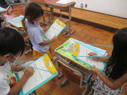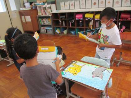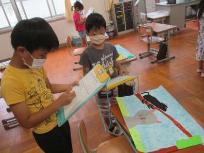 「みてみて おはなし」の絵が完成したので,みんなでお友達の作品の鑑賞をしました。友達の作品の素敵なところ・おもしろいところ・いいところを見つけることができました。
