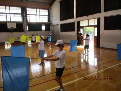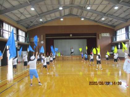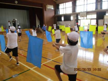 それぞれ腕を伸ばしたり,旗を持ちかえたり,メリハリのある動きをしたりと細かな部分を伝えるとすぐに実践!!